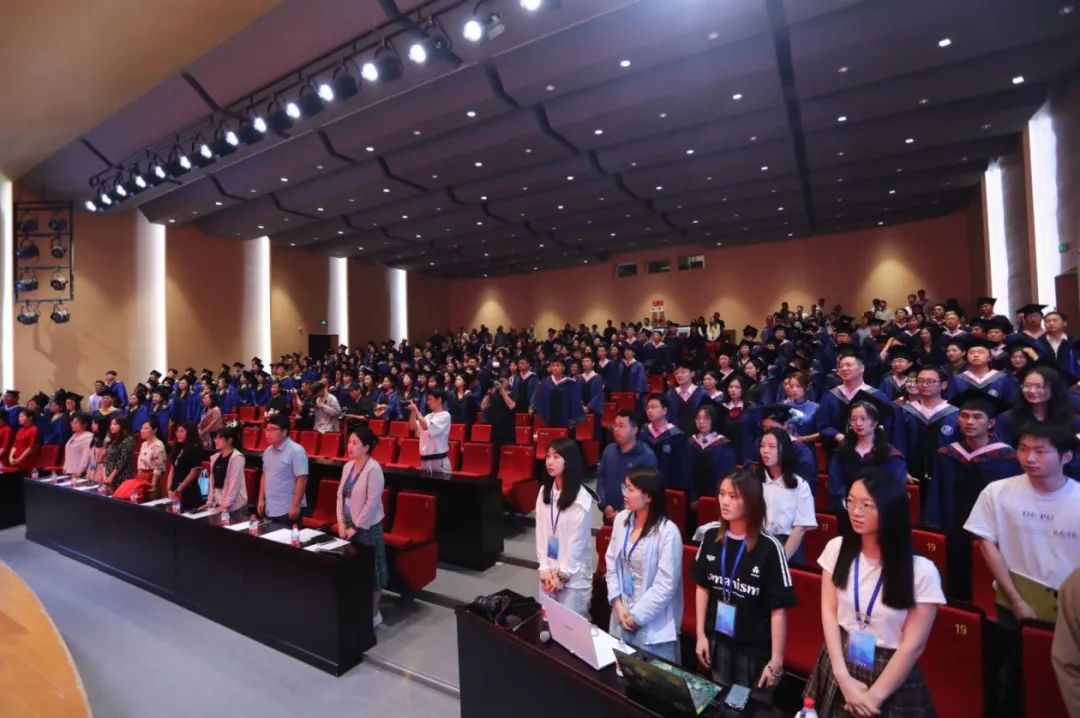 典礼在庄严的国歌声中拉开帷幕,毕业生们身着学位服肃然站立,齐唱国歌。