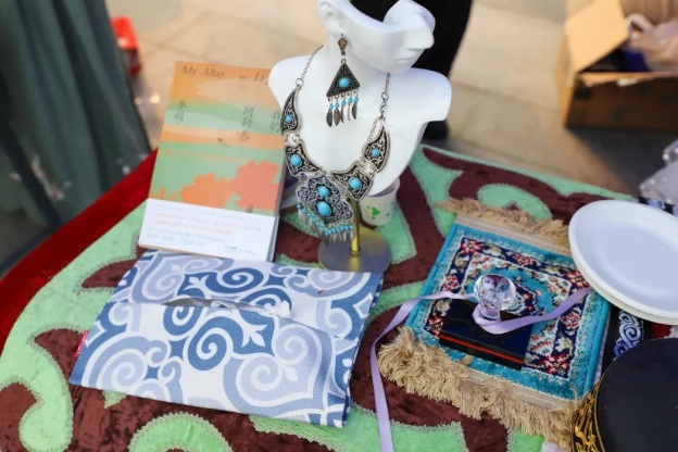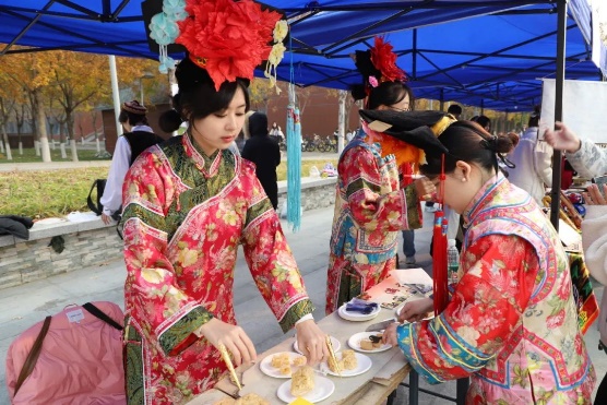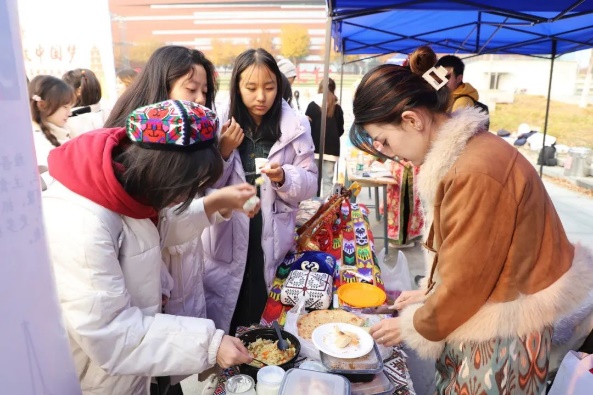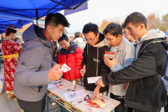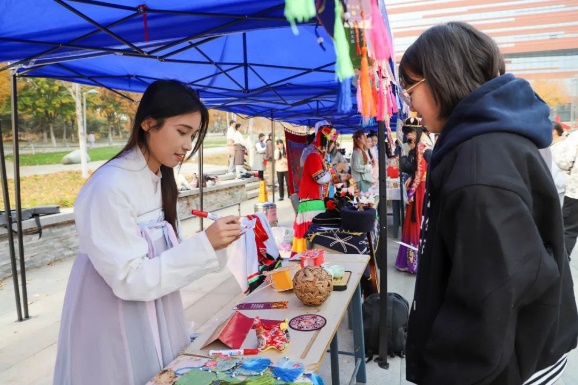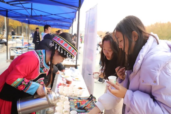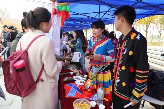 中华民族风情展台则更加热闹非凡,各民族风情展台让同学们驻足停留、流连忘返。各个民族的特色美食分台陈列,不论是香喷喷的新疆烤馕、手抓饭,还是极具地域特色的青稞酒、奶渣饼,亦或是耳熟能详的雪花酥、青团,又或是其他各民族的特色美食,都让同学们垂涎三尺。展台上亦陈列了各个民族的特色产品,从彝族的手工艺绣品,土家族的吊脚楼模型,到满族的八旗娃娃,蒙古族的毛毡画、酒杯等,在各民族展台同学的引导下,同学们参与展台互动,真切感受多元一体、兼收并蓄的中华文化。