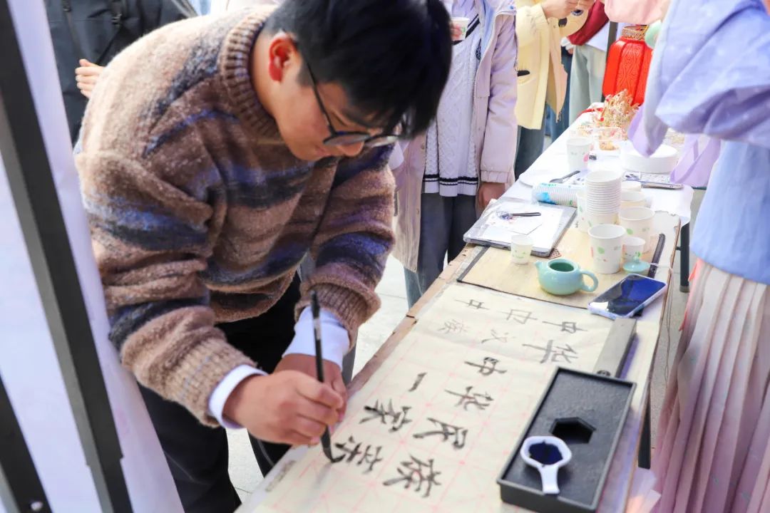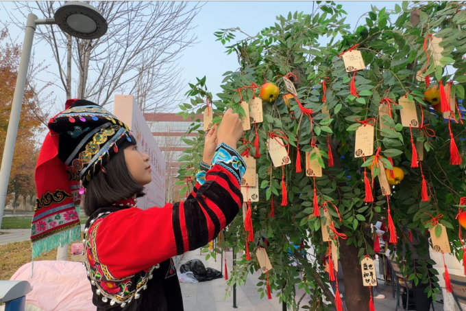在中华民族文字体验区,同学们用中华各民族文字写下“中华民族一家亲”“我爱你中国”等,在一笔一画中感受中华民族文化的无限魅力,同学们在“中华民族常青树”上写下心愿祝福,表达了各族青年对伟大祖国澄澈的热爱。