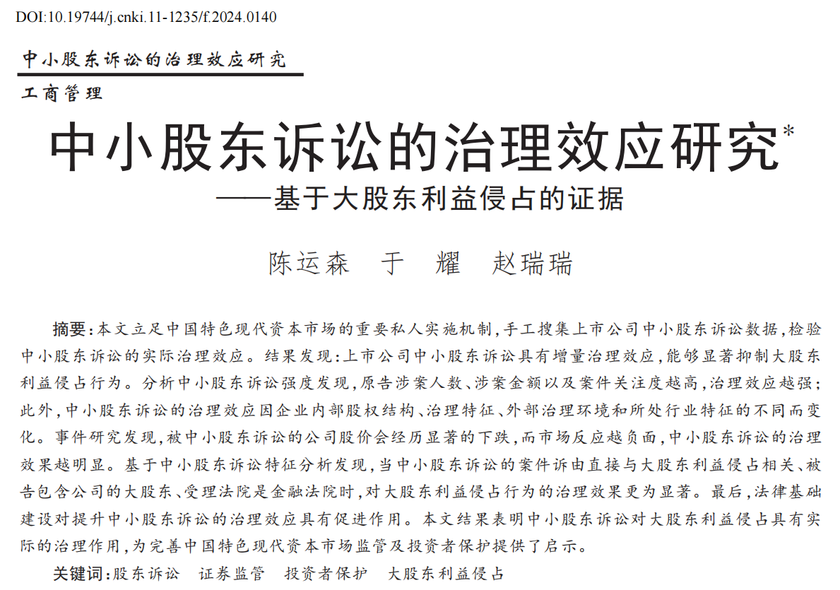 陈运森,于耀,赵瑞瑞. 中小股东诉讼的治理效应研究——基于大股东利益侵占的证据 [J]. 管理世界, 2024, 40 (12): 200-226.