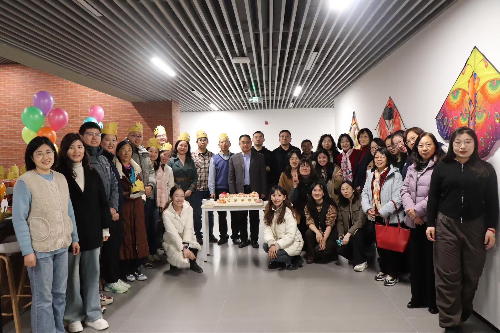 生日会现场,气氛热烈。到场老师们为“寿星”送上真挚祝福,大家品尝着甜美的蛋糕,三三两两聚在一起,从2025年学院工作计划到家人、健身、旅游,展开了轻松的交流,现场充满了欢声笑语。