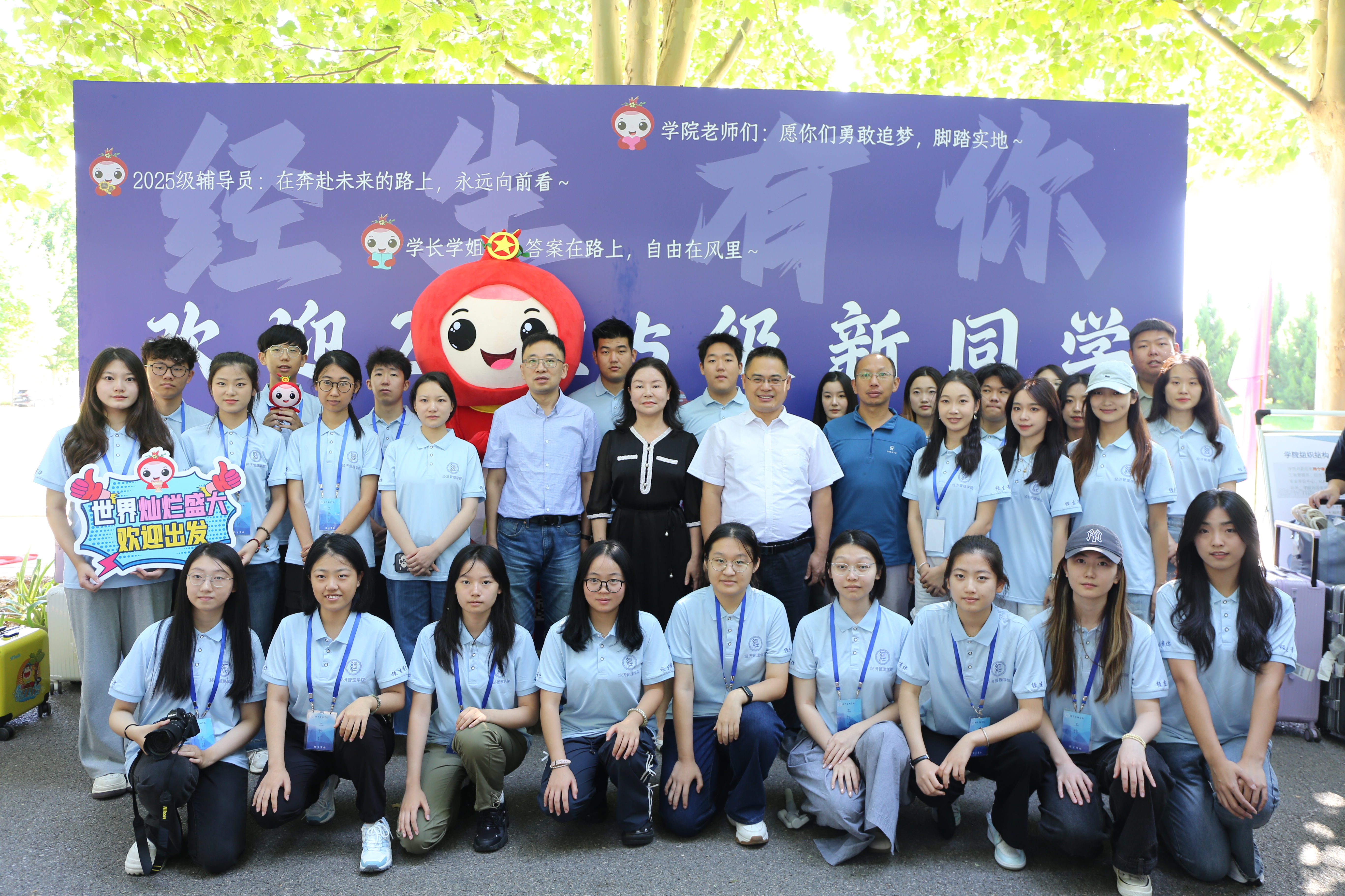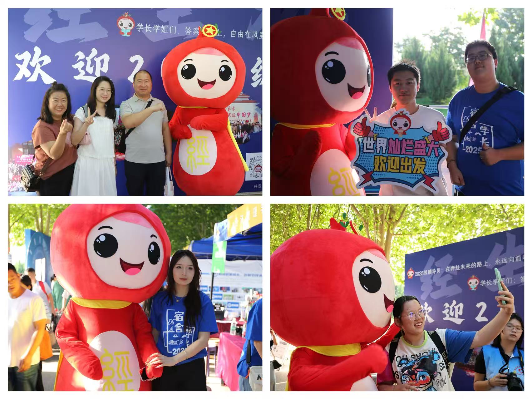 迎新现场,处处洋溢着青春的活力与喜悦。玩偶服打卡墙前,“经小管”与新生们亲切互动,快门轻响,一张张鲜活的笑脸被定格,这些照片超越了普通影像的意义,成为新同学与学院初遇时最温柔、珍贵的记忆。