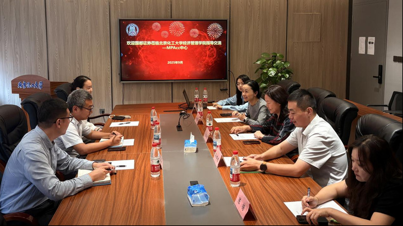 9月16日下午,北京化工大学经济管理学院MPAcc中心在校内召开与国都证券的交流指导会。国都证券东中街营业部总经理谭澍、机构业务部经理韩洋、投资顾问胡新员一行出席,院党委书记高红峡、副院长孙祥栋、经济管理学院MPAcc中心主任吕文岱、研究生秘书陈楠、辅导员樊荣以及学生代表共同参加。会议重点围绕未来校企合作、学生实习与就业支持等议题展开深入交流。