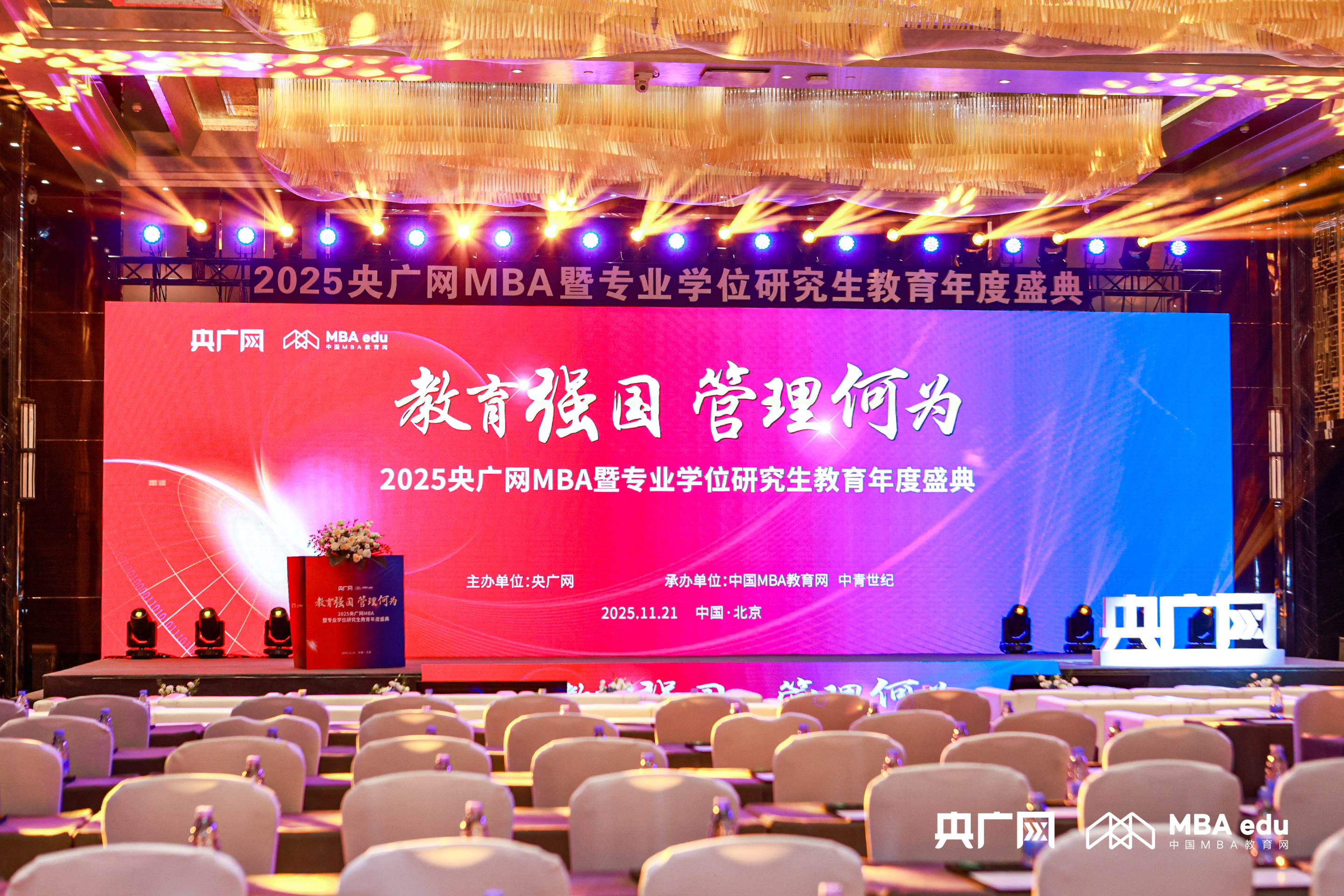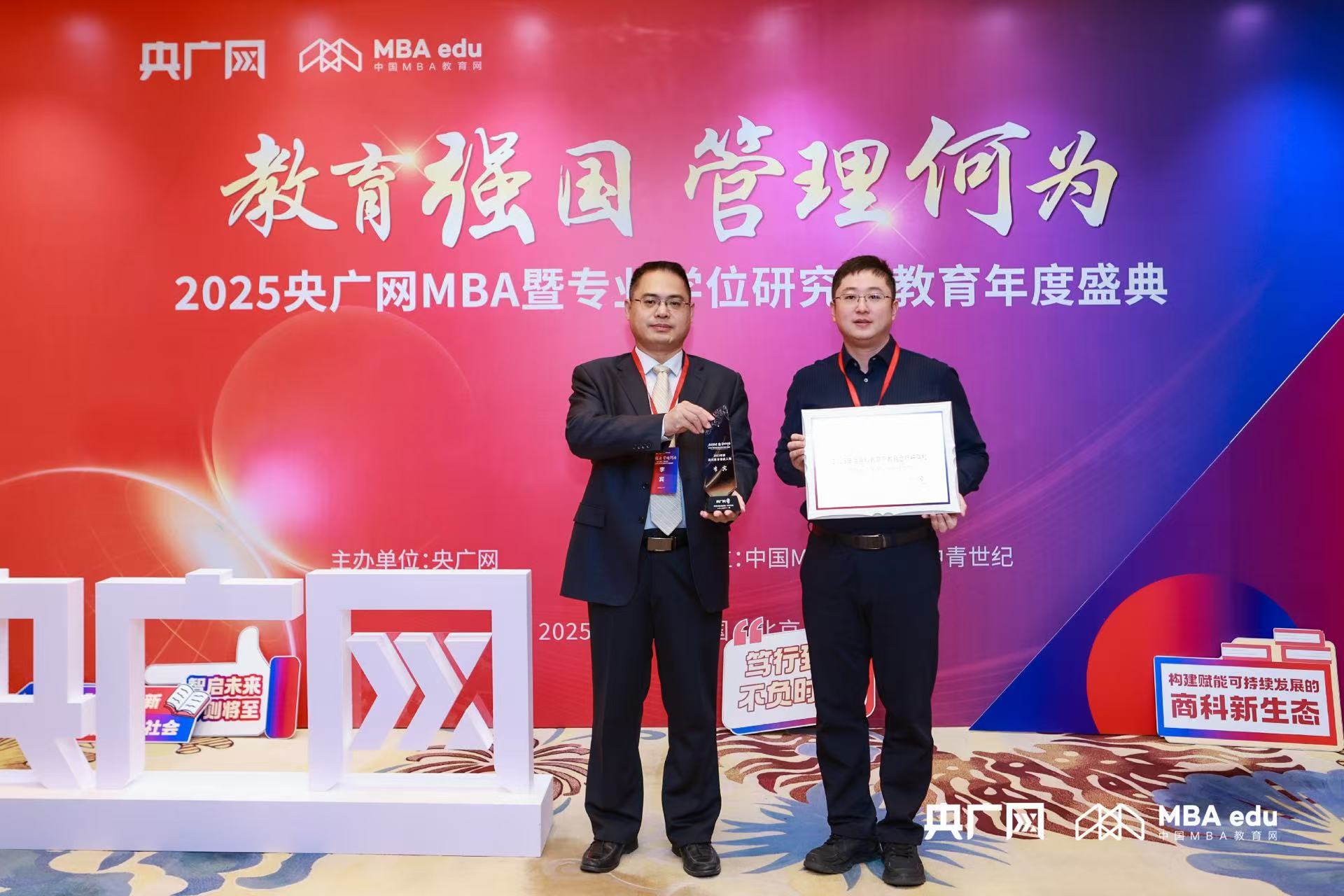 2025年11月21日,由央广网主办,中国MBA教育网、中青世纪承办的“2025央广网MBA暨专业学位研究生教育年度盛典”在北京隆重举办。本次盛典汇聚了全国百余所商学院的知名专家学者、院校代表及行业领袖,共商教育强国发展大计,携手擘画管理教育事业新蓝图。北京化工大学经济管理学院院长李宾、MBA/MEM中心主任刘锐剑受邀出席本次活动。