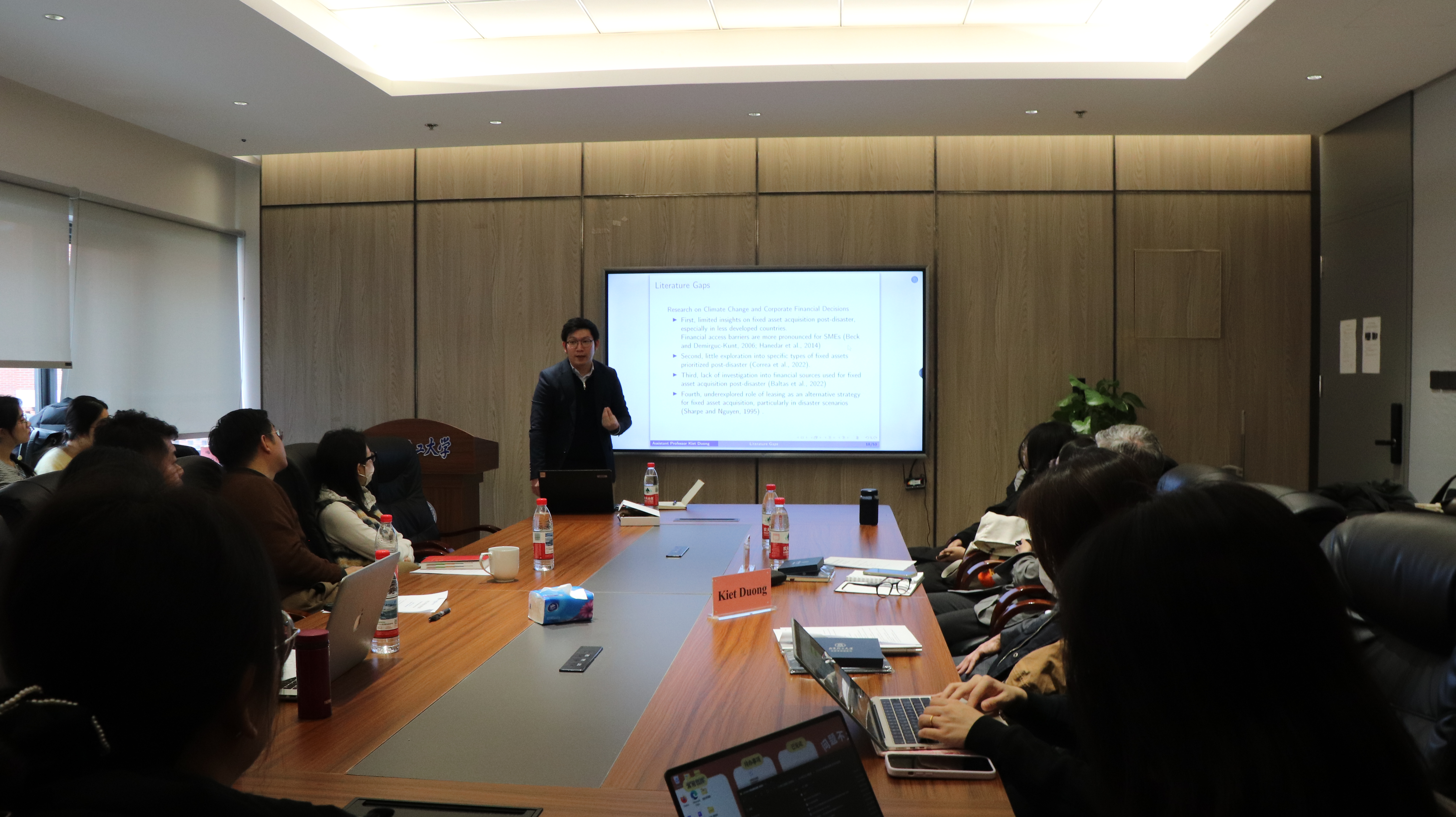 签约仪式后,由约克大学代表团进行主题报告。本次报告由Kiet Duong主讲,经济管理学院师生共同参与。报告主题聚焦“极端天气与生物多样性风险对企业财务决策的影响”。报告中,Kiet Duong博士围绕极端天气与生物多样性两大环境相关风险,系统剖析其对企业融资行为的深层影响及应对路径。报告内容兼具学术深度与实践价值,引发在场师生的强烈共鸣,互动提问环节气氛热烈。
