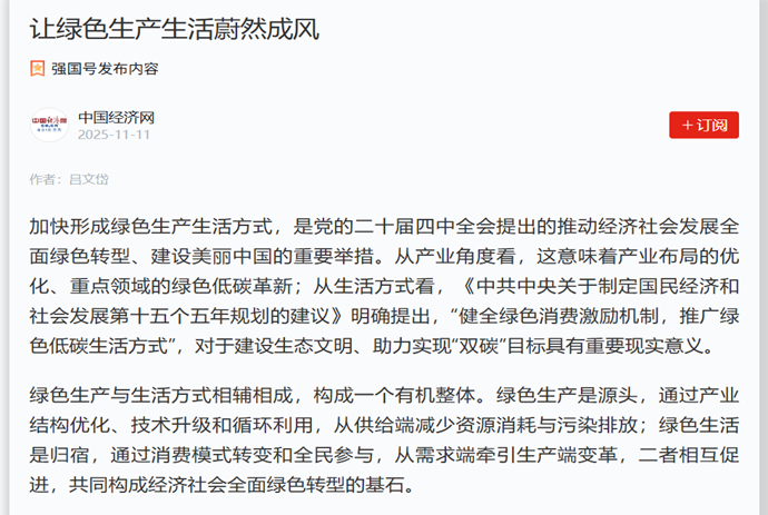 该文指出加快形成绿色生产生活方式,是党的二十届四中全会提出的推动经济社会发展全面绿色转型、建设美丽中国的重要举措。从产业角度看,这意味着产业布局的优化、重点领域的绿色低碳革新;从生活方式看,《中共中央关于制定国民经济和社会发展第十五个五年规划的建议》明确提出,“健全绿色消费激励机制,推广绿色低碳生活方式”,对于建设生态文明、助力实现“双碳”目标具有重要现实意义。