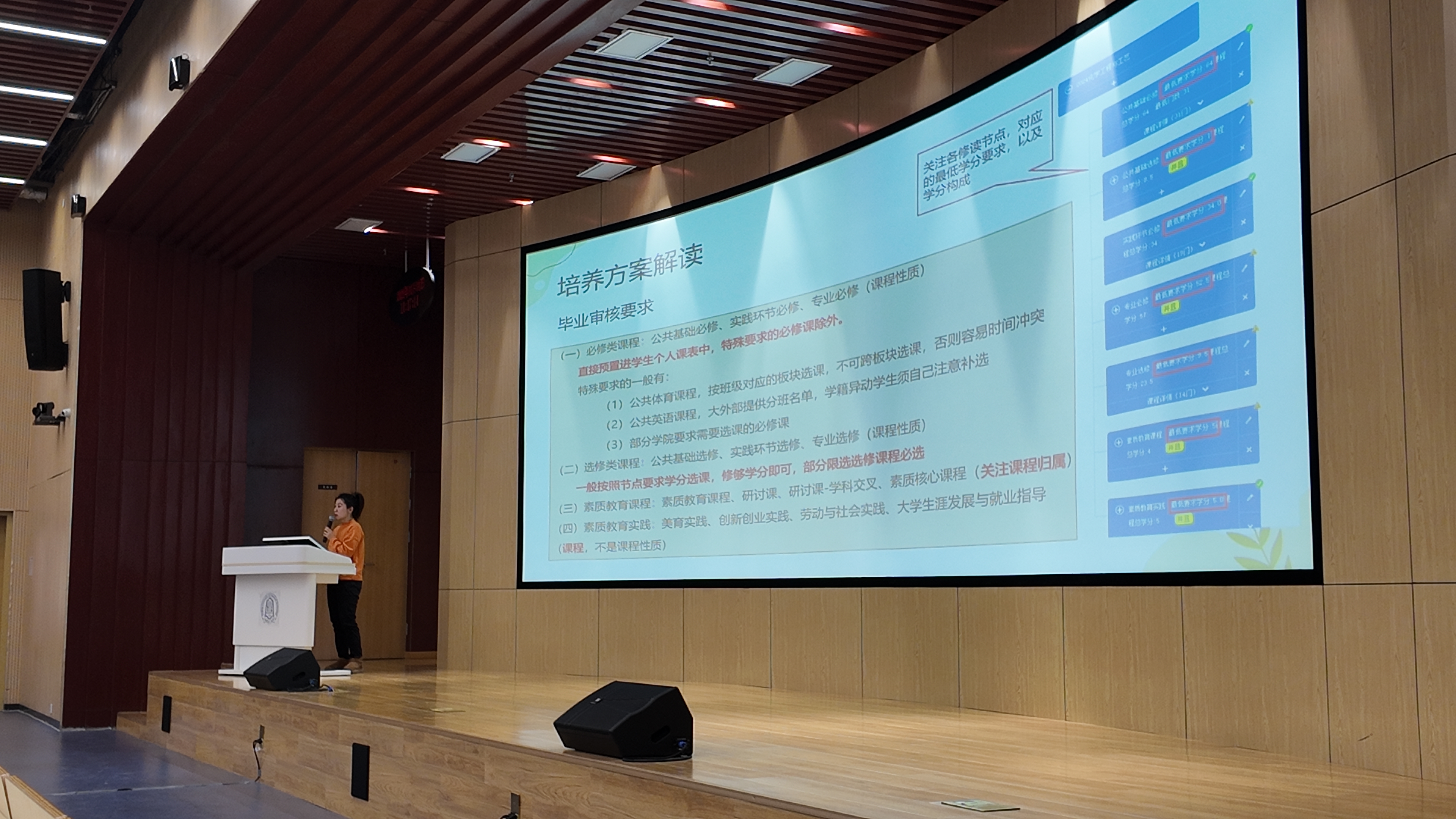 在培养方案解读环节,学院围绕培养目标、毕业学分构成、课程体系设置、核心课程安排、素质教育课程分类要求以及实践教学环节学分标准等内容,对培养方案的核心要素进行了系统梳理和说明。在选课指导环节,重点介绍本科生教务管理平台的操作流程,以及课程冲突、容量限制等常见问题的处理方法,并对选课时间节点、退改选规则和学位课程绩点要求等关键事项进行了详细提示。针对跨年级、跨专业选课及创新学分认定等学生普遍关注的问题,设置现场答疑环节,由相关教师逐一解答。