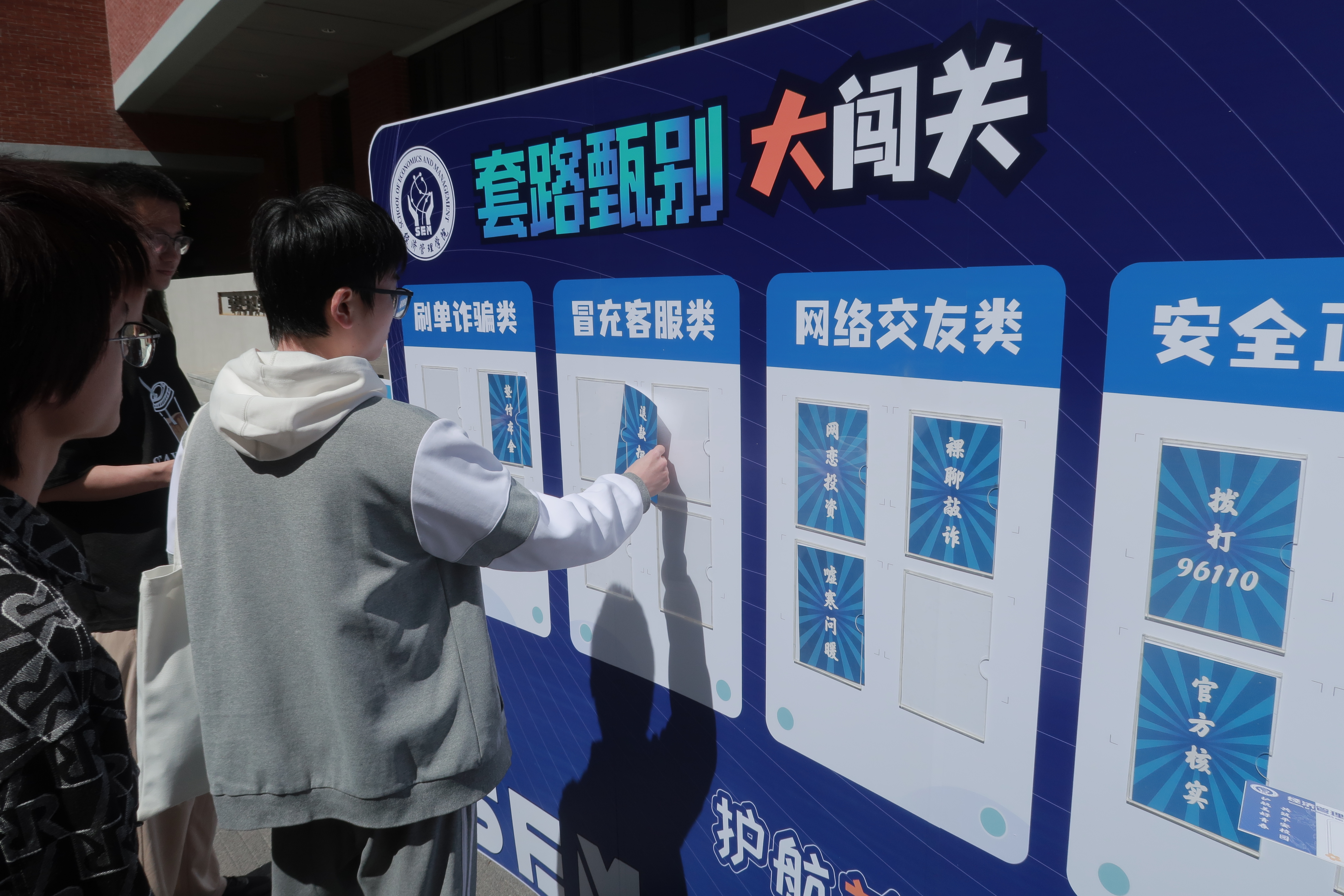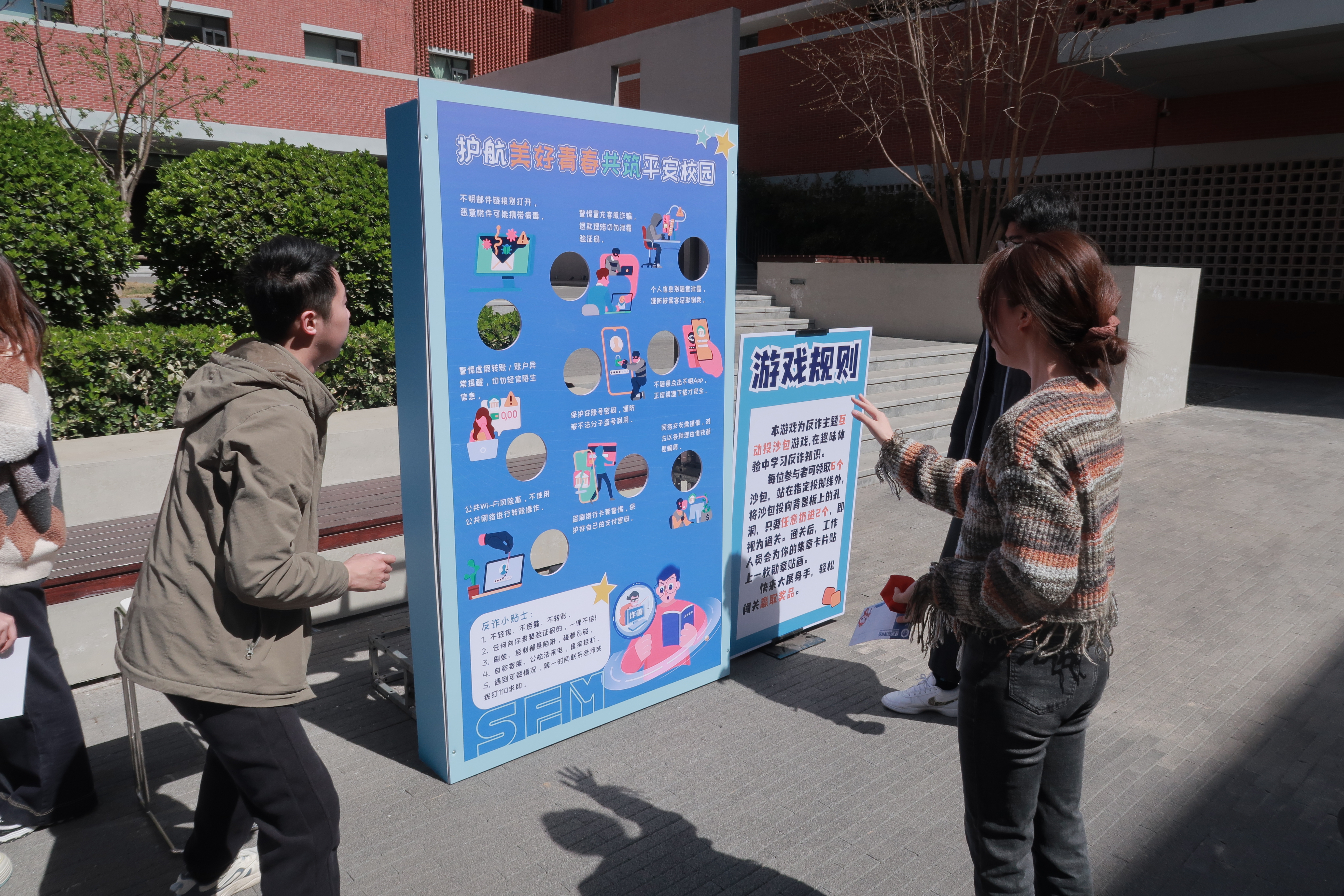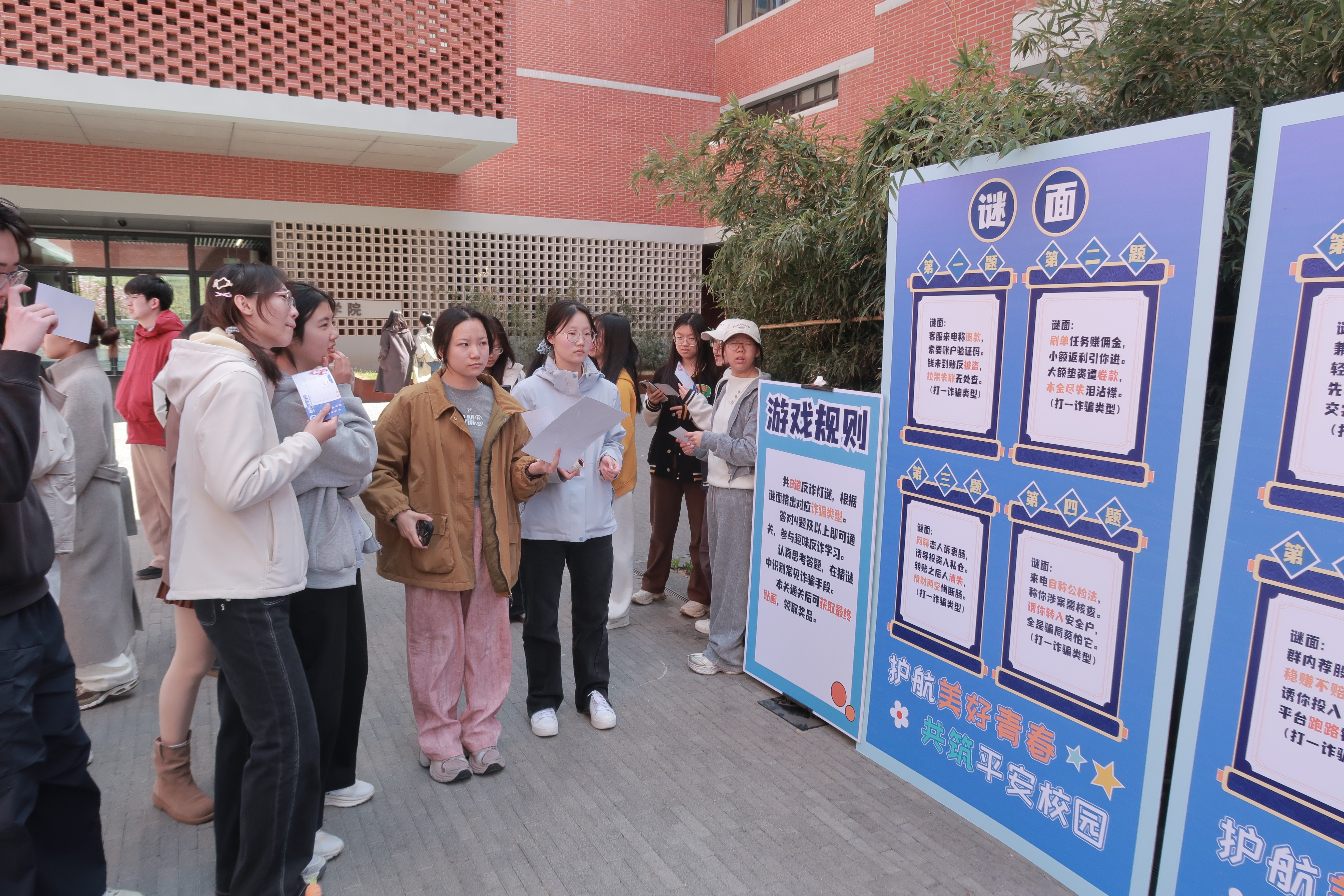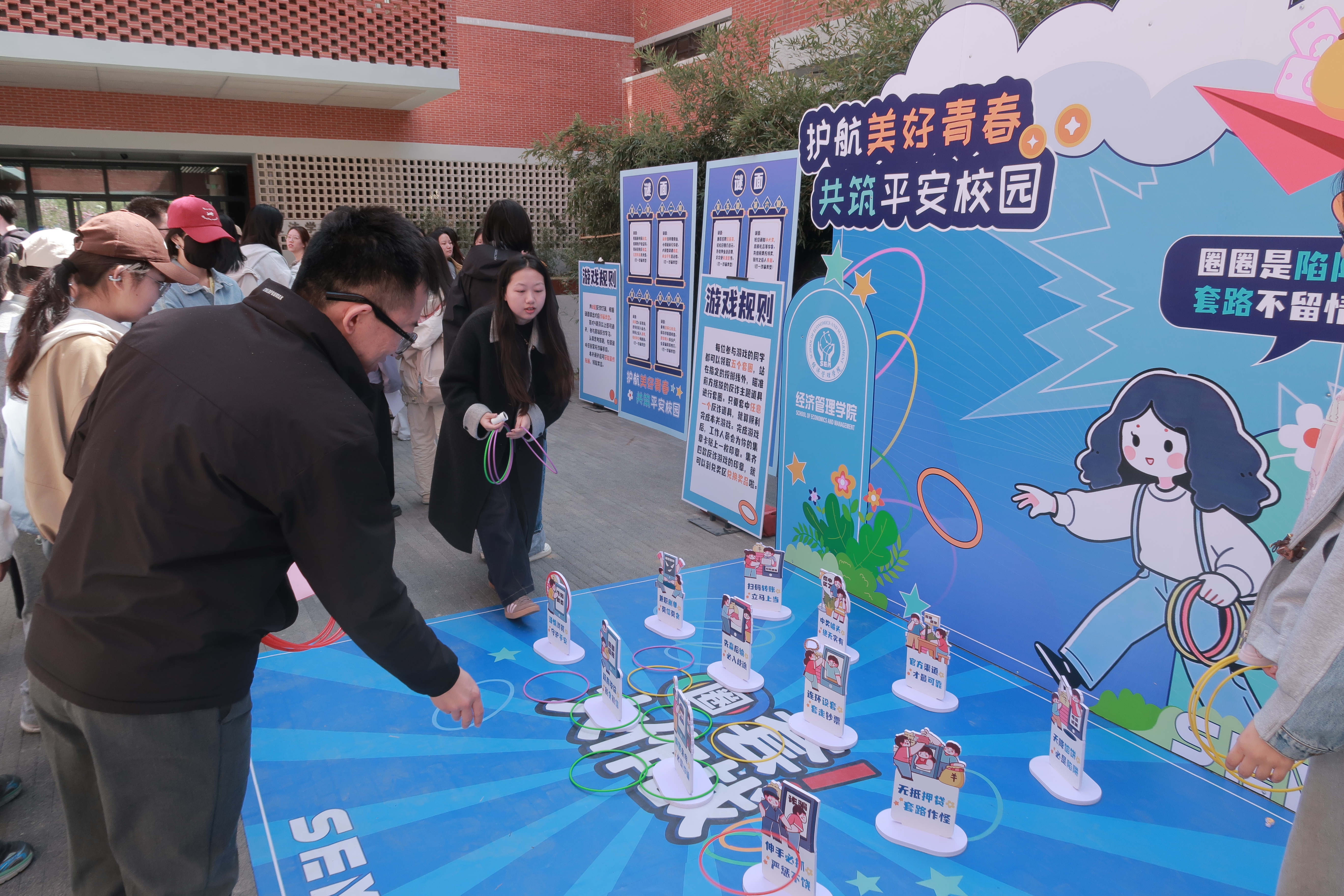 现场精心策划了反诈宣传互动体验区,将反诈知识融入趣味游戏,师生在游戏中学习防骗技巧。本次反诈宣传设置了“套圈识诈”、“投沙包防诈”、“谜面试猜谜”、“套路甄别大闯关”等多个互动游戏环节。各游戏环节融入不同类型的防骗知识,大家通过参与游戏闯关,在轻松愉快的氛围中学习了刷单返利、冒充客服、网络交友、校园贷款等常见诈骗类型的识别技巧,牢记了“不轻信、不透露、不转账”的防骗三字经。活动现场气氛热烈,师生参与热情高涨。